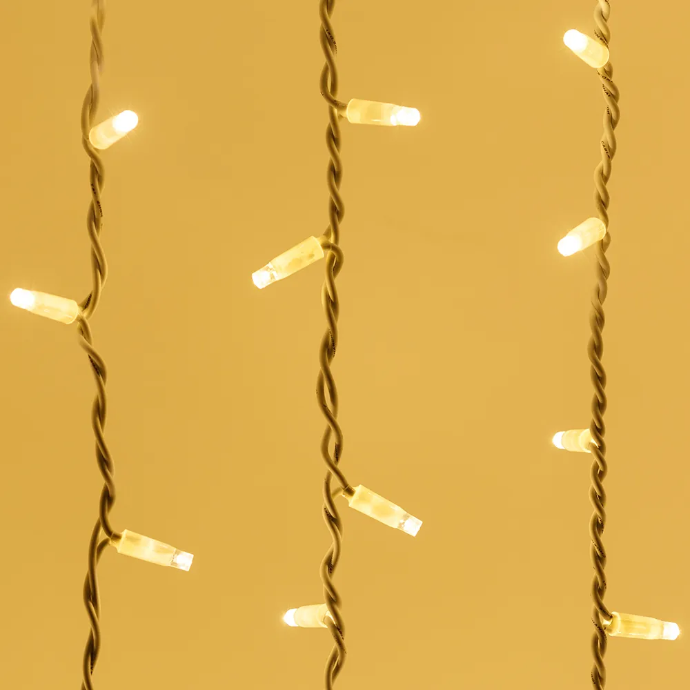 Светодиодный Занавес Pro. Размер 2000x3000 мм (длина 2000 мм, высота 3000 мм). 20 ниспадающих нитей длиной 3000 мм. 760 светодиодов размером 7 мм. Цвет свечения ТЕПЛЫЙ БЕЛЫЙ (3000 К), постоянное свечение и 8 динамических эффектов с резким световым рисунком (прозрачная вогнутая линза). Провод белый, каучук. Питание 230 В, Мощность 70 Вт, защита IP65, применение в помещении и на улице под навесом. Аксессуар для подключения и выбора режима свечения в комплекте.