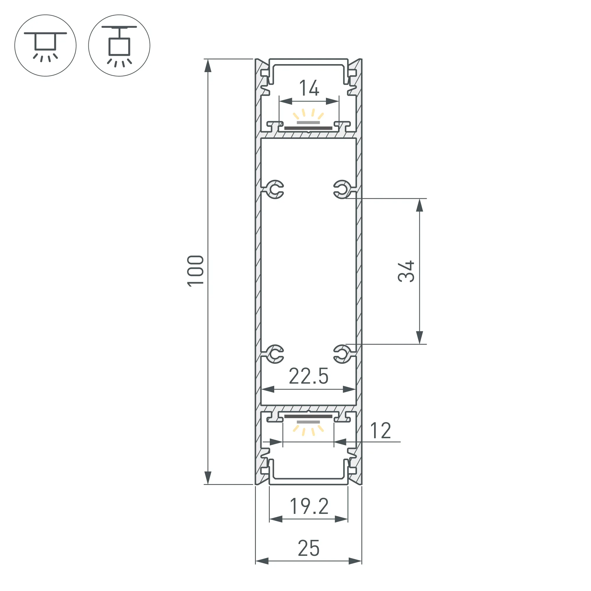 Под заказ от 100 м. Алюминиевый профиль для светодиодных лент и линеек, свечение вверх и вниз. Цвет - шампань золотой (порошковая окраска). Габаритные размеры (L×W×H): 2500x25x100 мм. Ширина площадки для ленты 12 мм. Экраны, заглушки и другие аксессуары приобретаются отдельно. Цена за 1 метр.