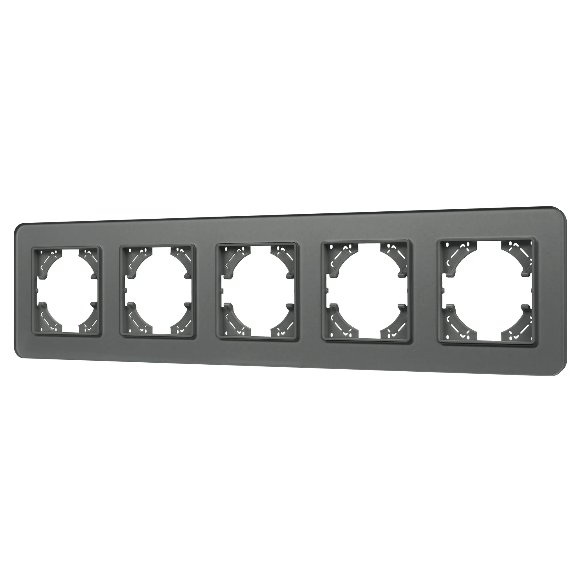 Рамка стеклянная на 5 постов, под встраиваемый механизм. Цвет - серый с Soft-Touch покрытием. Уровень герметичности IP20. Ориентация монтажа - горизонтальная (основным ориентиром служат посадочные выступы для накладки механизма).
